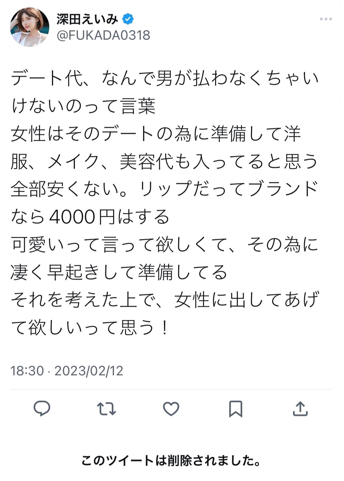 【定番議論】人気セクシー女優 深田えいみさん「女性はデートの準備で早起きしてメイクする上に洋服代/美容代がかかるからデート代は男が払うべき」と持論語る