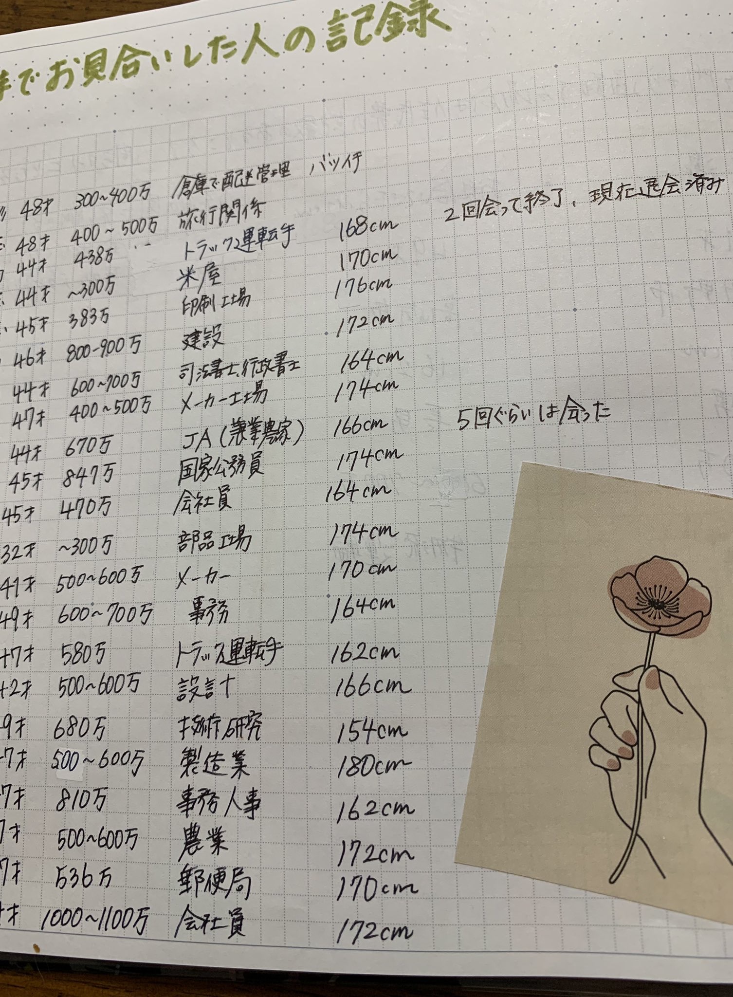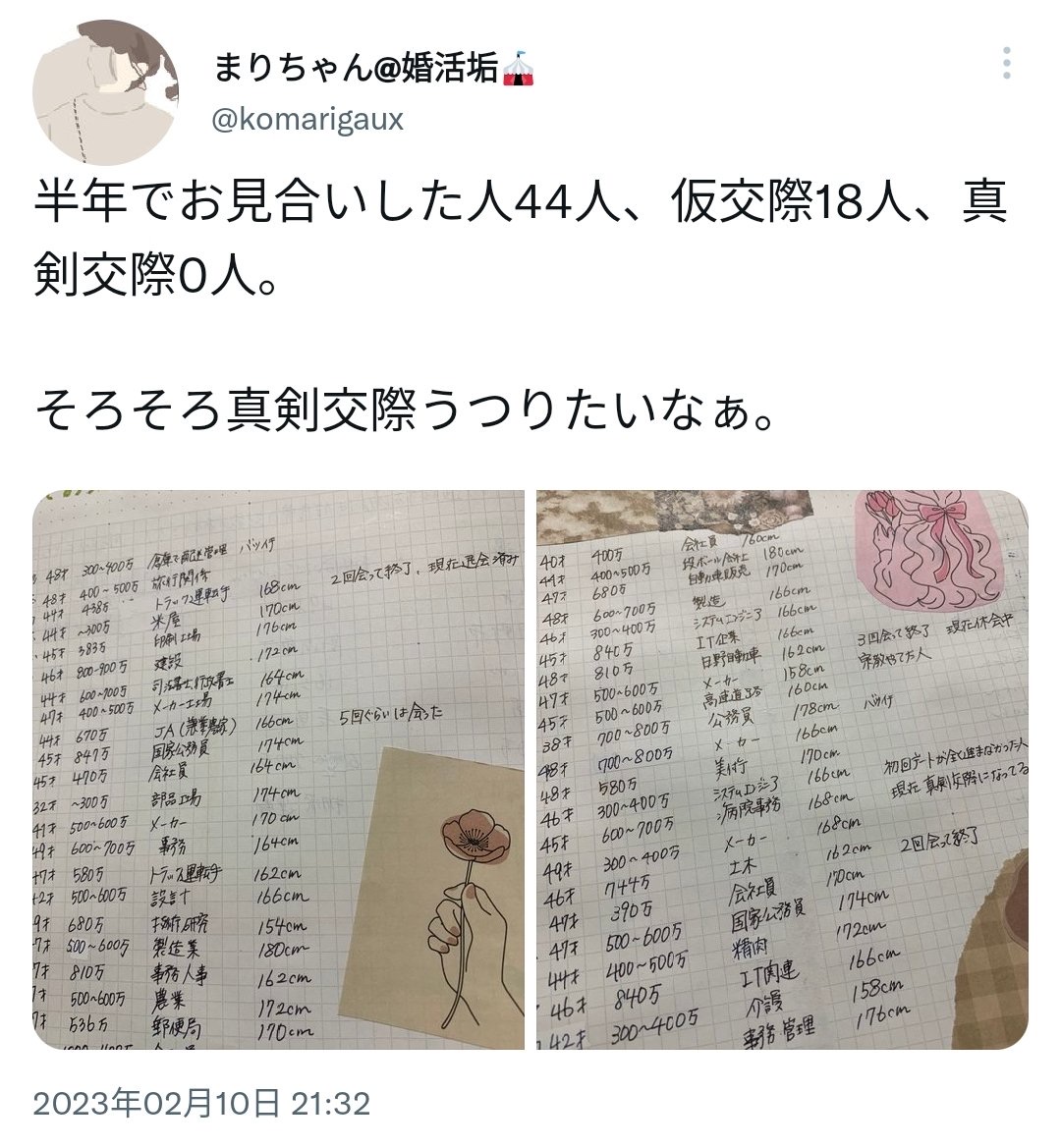 【話題】婚活女子(45)さん、丁寧に婚活相手のデータをノートにまとめるも何故かいまだ真剣恋愛には発展せず