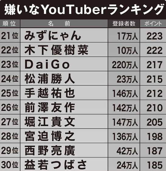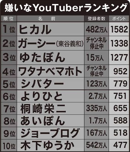 ゆたぼんってあの知名度とこの嫌われ度なのに登録者数は他と比べて大したことねえのな