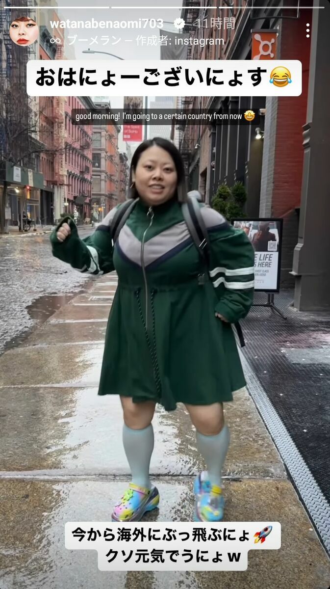 20キロ減量し引き締まった姿が話題となっていた渡辺。この日は「おはにょーございにょす 今から海外にぶっ飛ぶにょ クソ元気でうにょw」とつづり、緑色のミニワンピースに、カラフルなサンダル、水色のハイソックスというおしゃれな私服姿をストーリーズに掲載した。