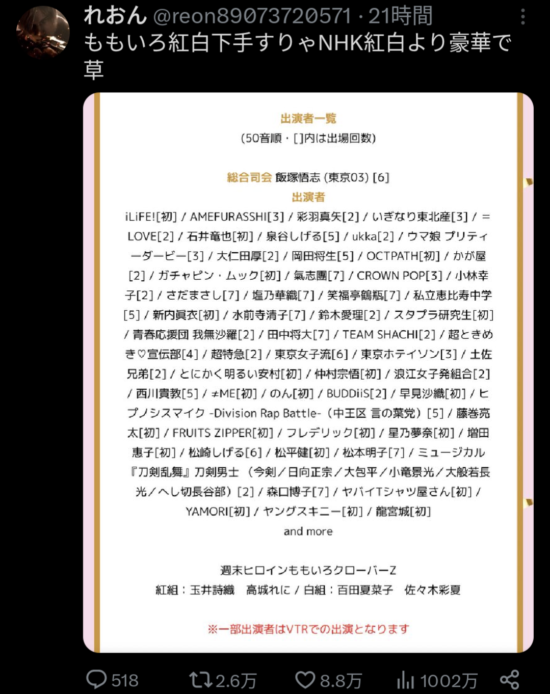この顔ぶれを「ももクロ」ファンは、本家落選への恨みもあり、「本物の紅白より豪華」と礼賛。