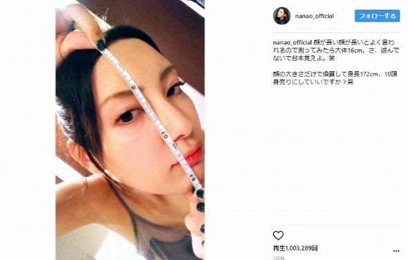 「顔が長い顔が長いとよく言われるので」と耳に入ったという疑惑の声を受けて、額から顎までの長さを堂々と公開測定した菜々緒さん。日本人女性の平均は20センチ前後といわれていますが、メジャーの目盛りは驚異の16センチを指し示しており、「顔の大きさだけで換算して身長172cm、10頭身売りにしていいですか?」と、単純計算でも10頭身を超えるプロポーションであることを証明しています。ちっさ……。