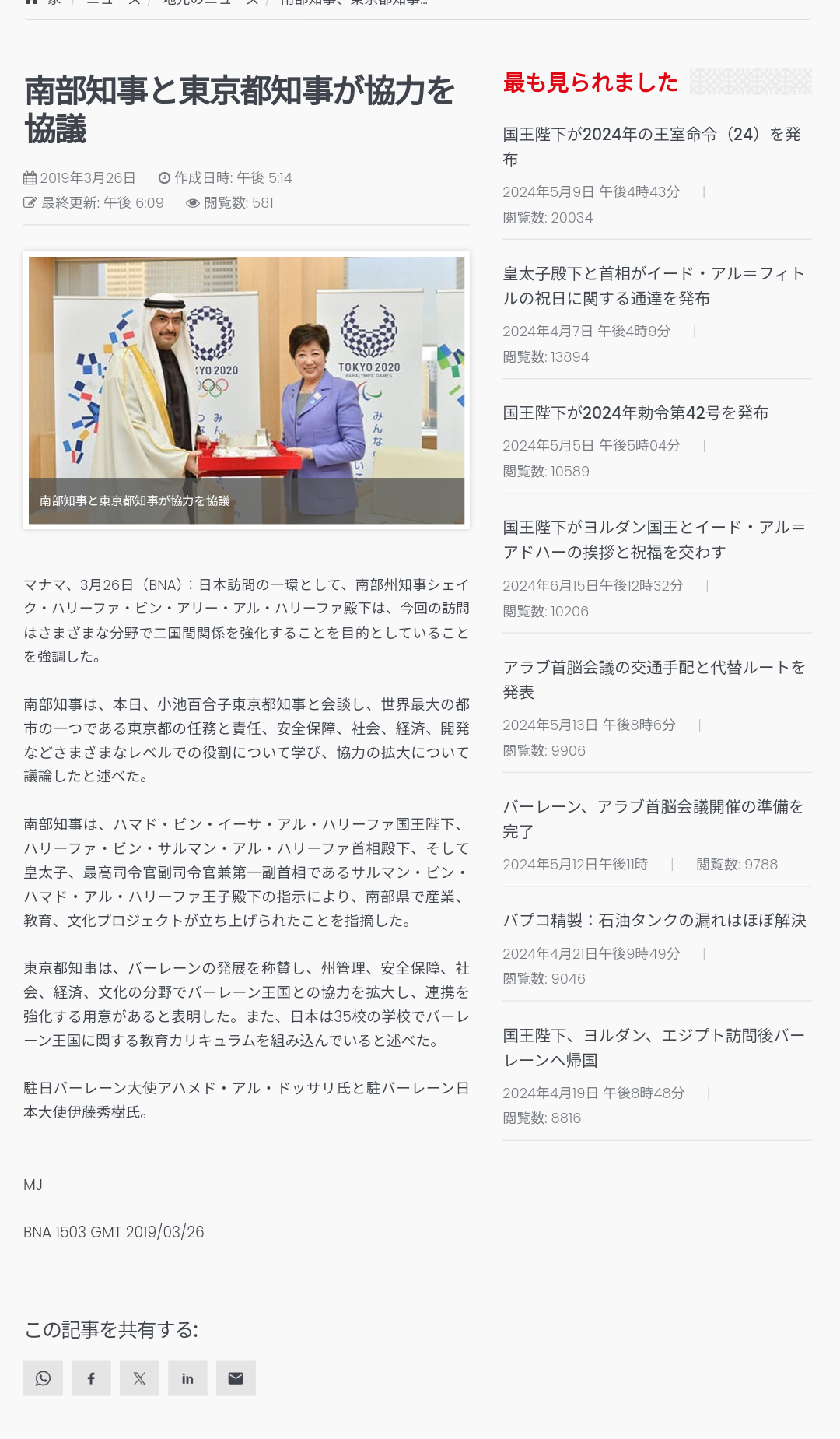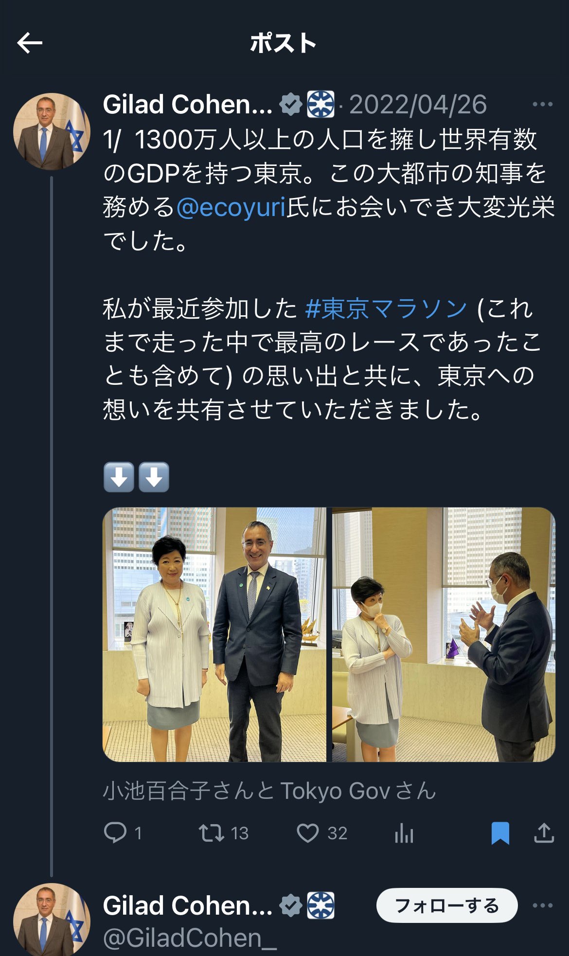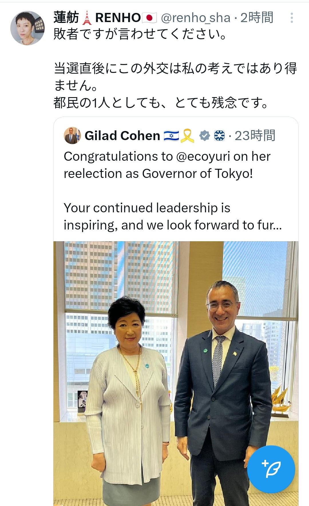 イスラエル大使が小池都知事との2年前の写真をアップして当選祝いのメッセージ。