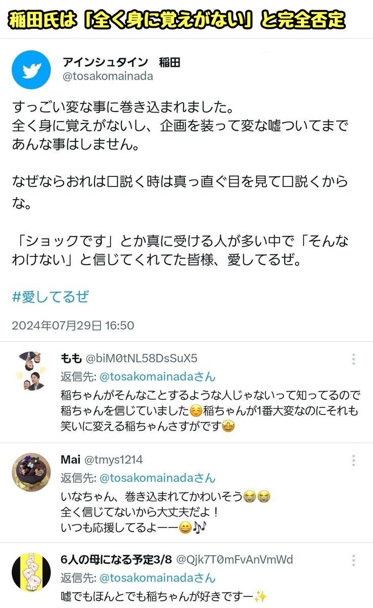 以上の流れをコレコレ氏に告発されるも、稲田氏は「全く身に覚えがない」と完全否定