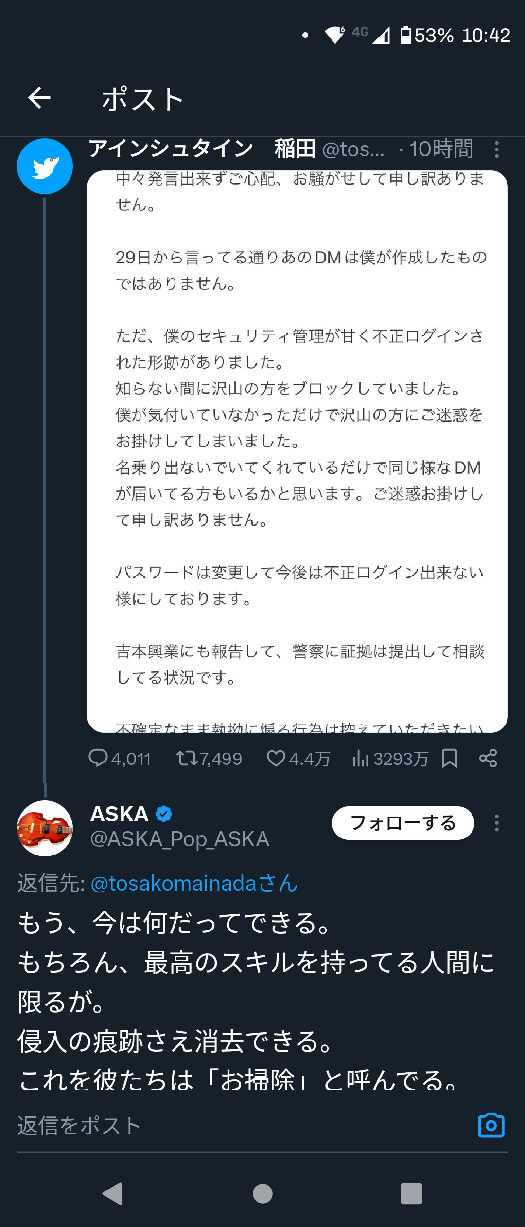 なので、垢を乗っ取られているのか本人かのどちらかです。