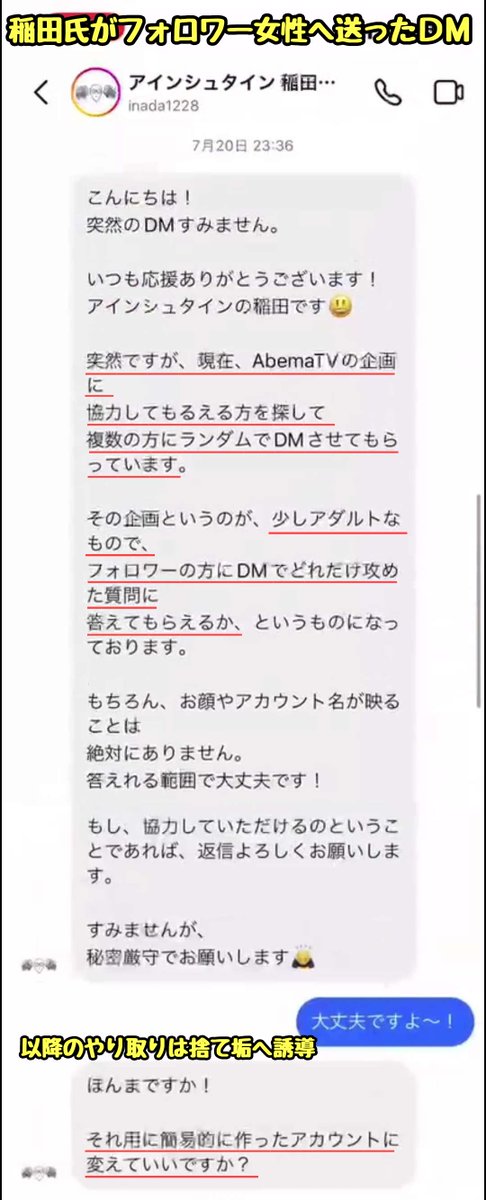 稲田氏がインスタのフォロワー女性Aに「いまAbemaTVで『フォロワーにどれだけ攻めた質問に答えてもらえるか』という企画をやっている」とDM送信
