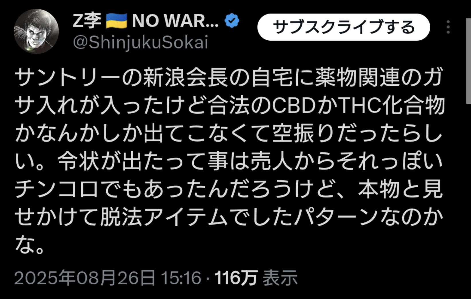 実際に、家宅捜索で製品そのものは発見されず、簡易の尿検査も陰性で、警察もまだ捜査を続けている最中ではありますが、疑惑がかけられた時点で、サントリー側は『求められる資質を欠く』と判断したようです」