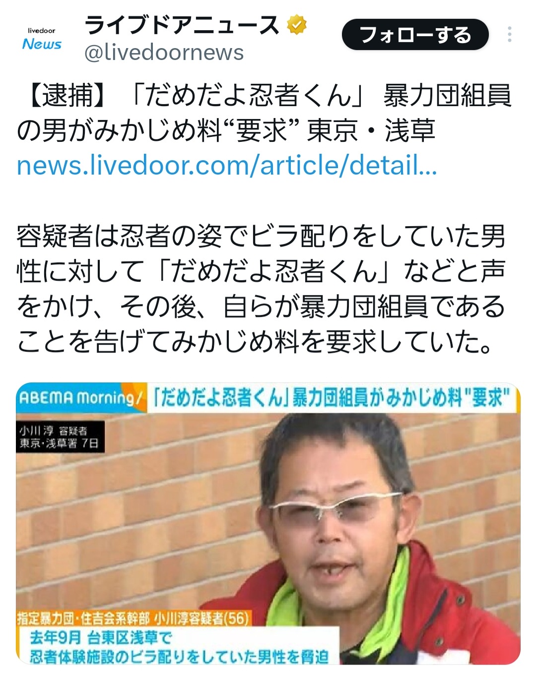 容疑者は忍者の姿でビラ配りをしていた男性に対して「だめだよ忍者くん」などと声をかけ、その後、自ら暴力団員であることを告げてみかじめ料を要求していた。