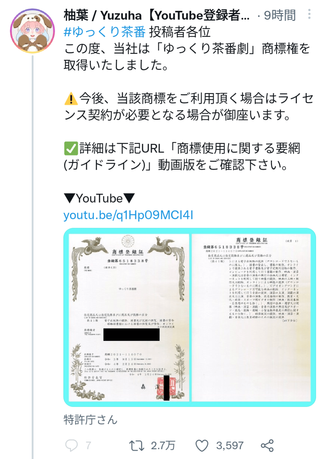 ゆっくり茶番劇っていうこいつの動画タイトルの商標をとっただけやから