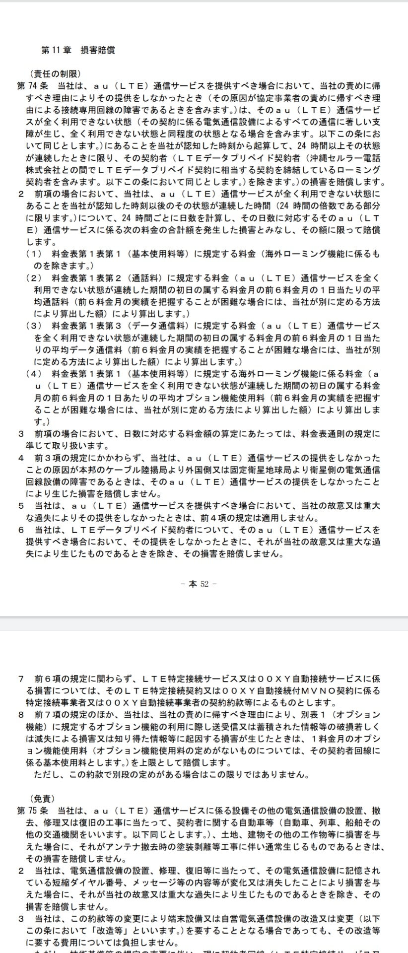 KDDIの個人向けサービスの契約約款では、通信サービスを「全く利用できない状態」が24時間以上続いた場合、損害賠償を支払うとの規定がある。